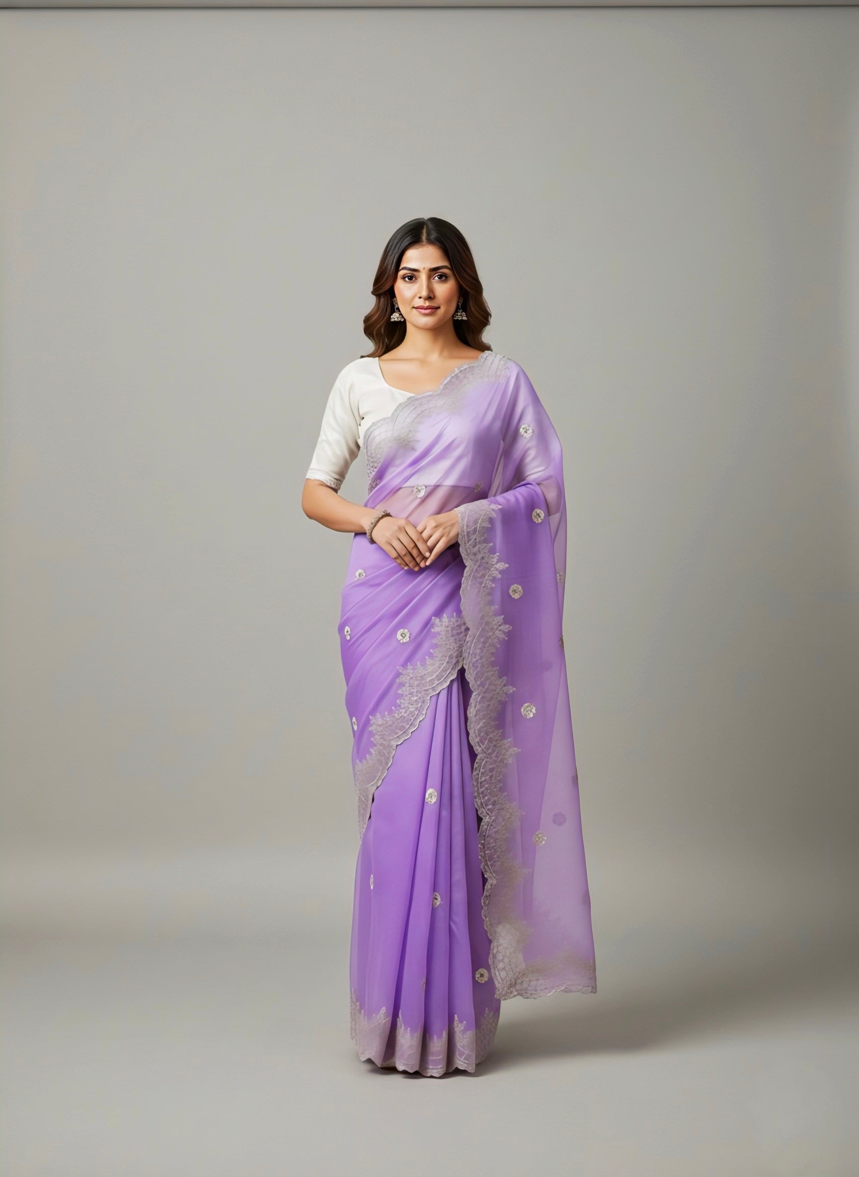 Elegance meets delicacy in this enchanting lavender saree, designed to radiate timeless beauty. The drape is adorned with intricate floral embroidery in soft white and lavender threads, giving it a fresh, graceful, and feminine charm. The finely detailed floral vines scattered across the body enhance its luxurious appeal while maintaining a light and airy flow.