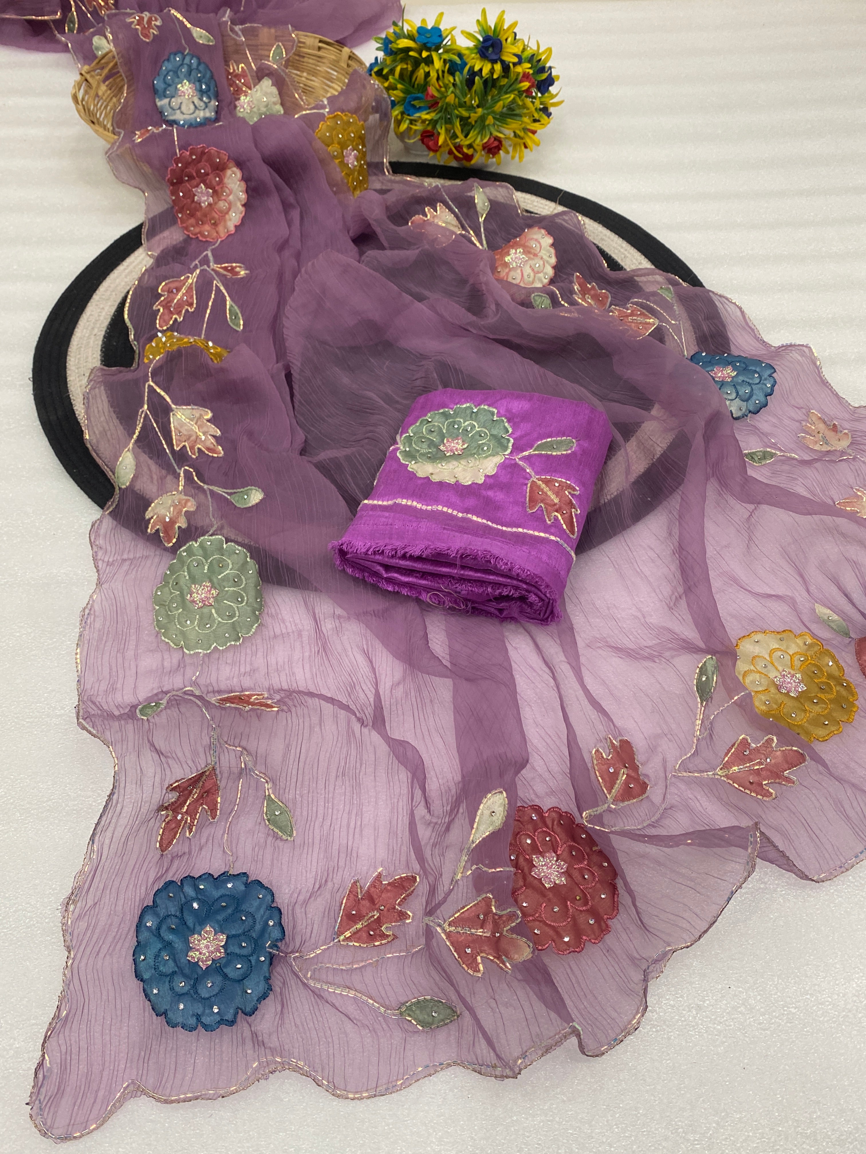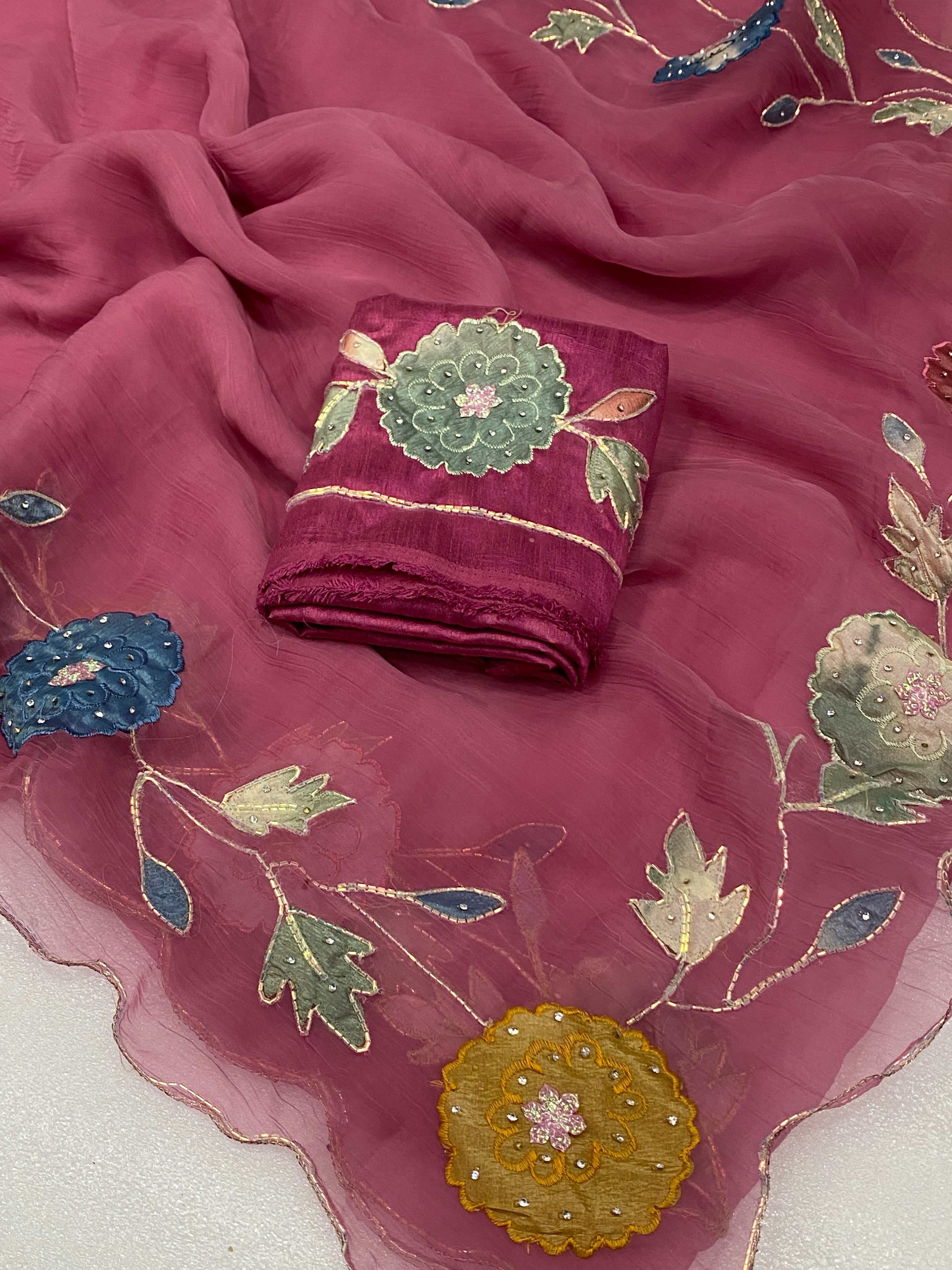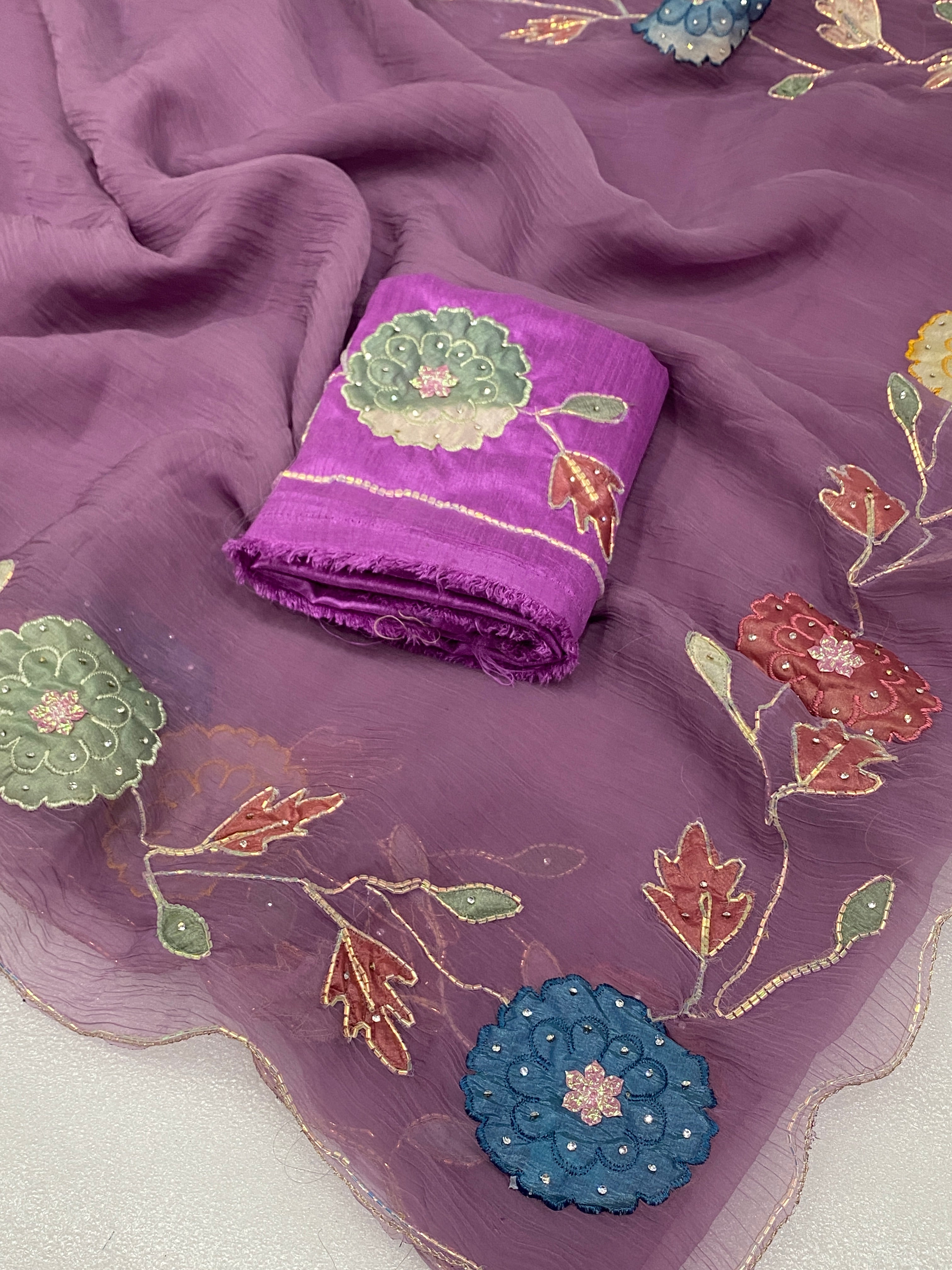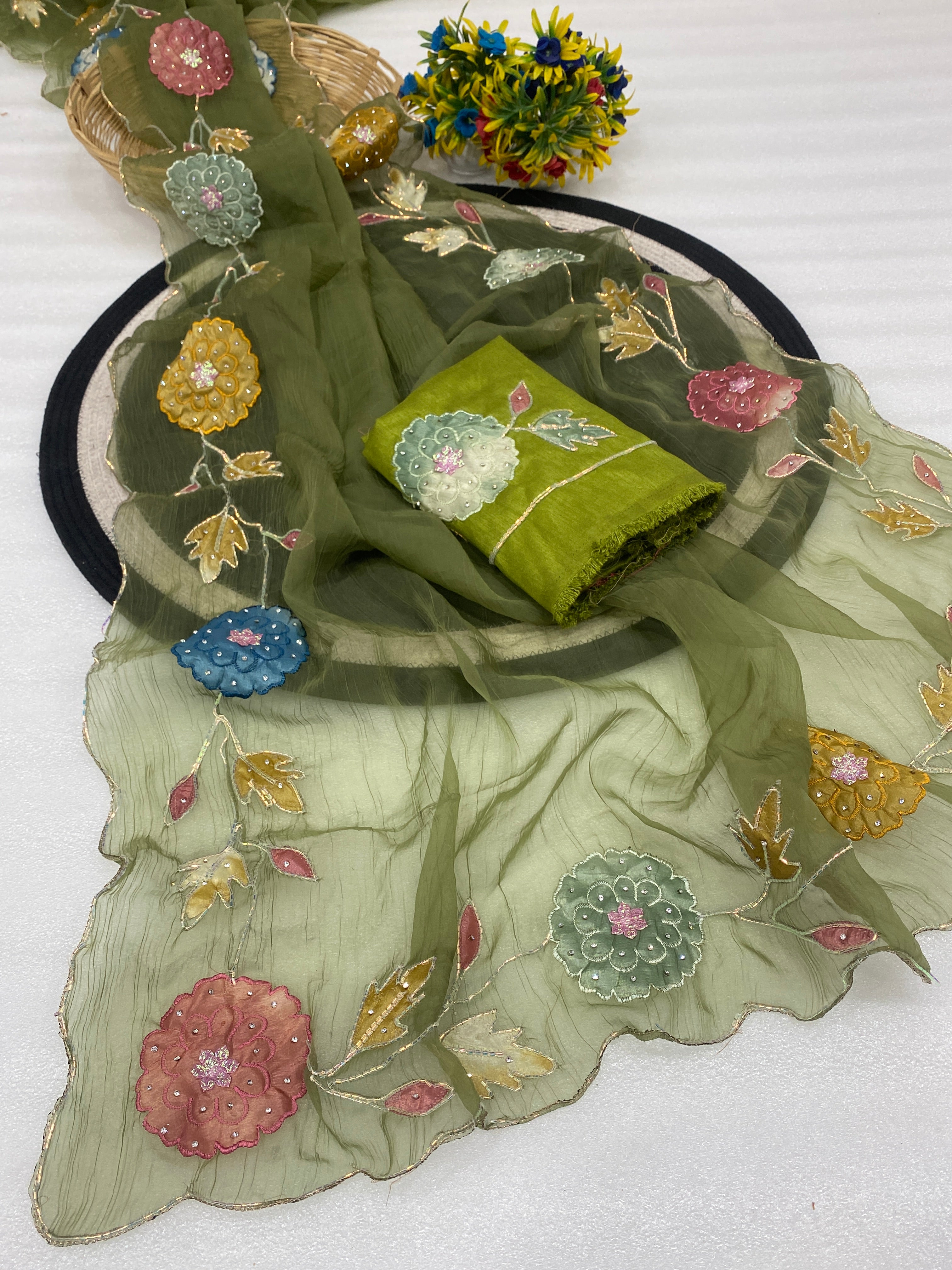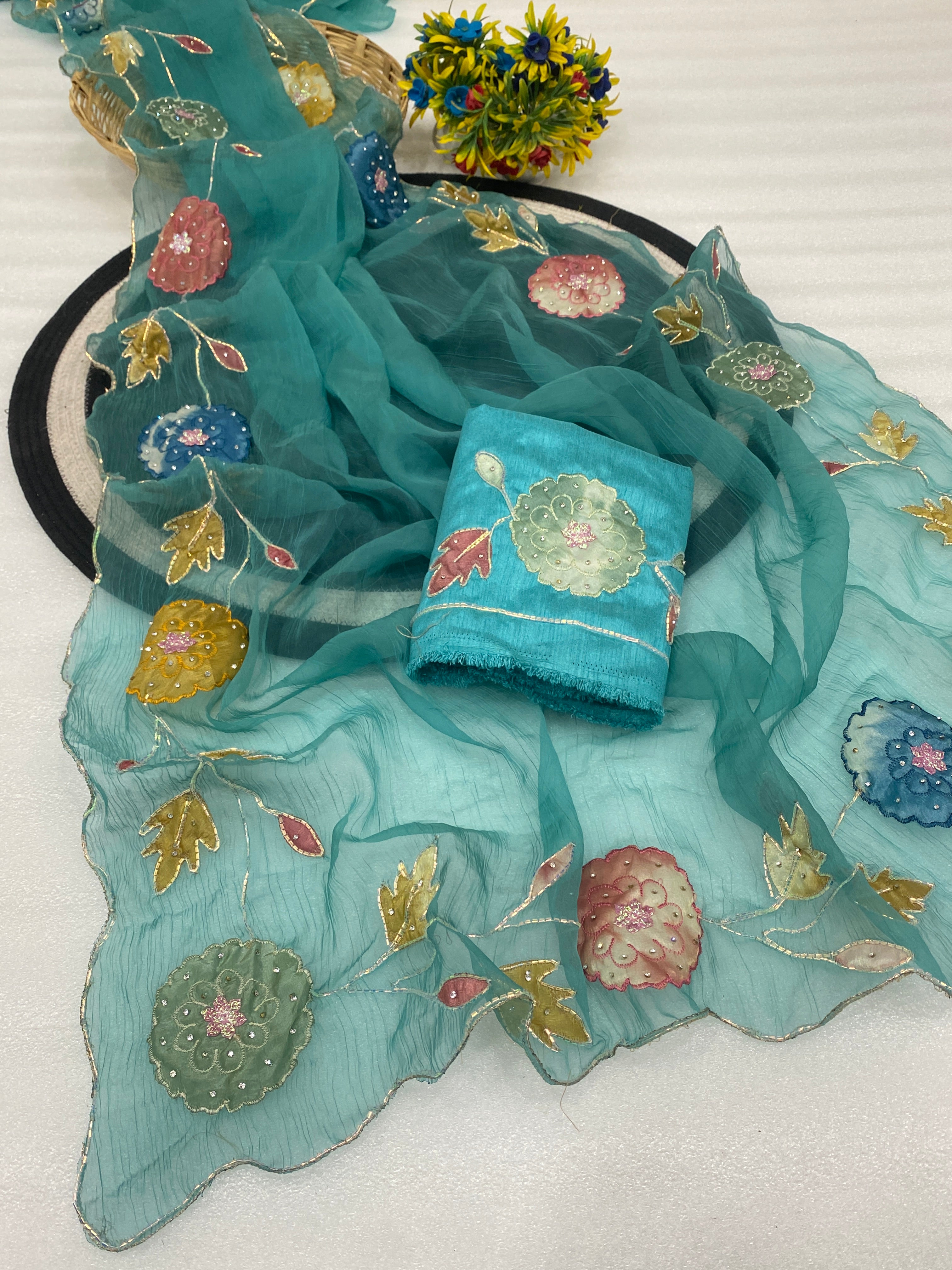 The accompanying blouse piece is richly decorated with a dense pattern of sequins and beadwork, harmonizing perfectly with the dupatta’s motifs.